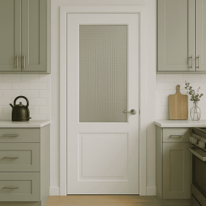 Las puertas blancas con cristal para cocina o las correderas con vidrio incorporado son muy populares. En estos casos, se recomiendan vidrios resistentes al calor y fáciles de limpiar.